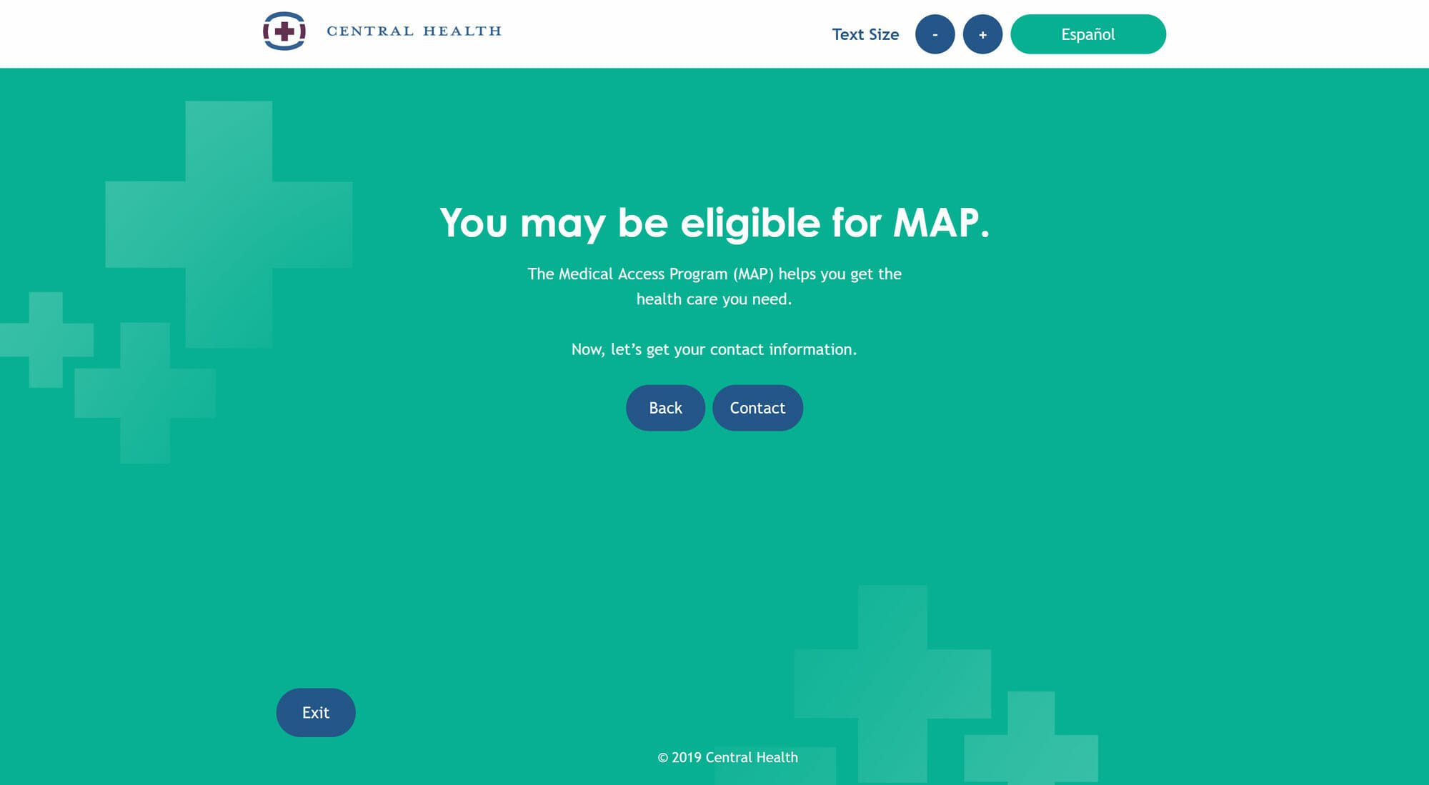 This project was to develop a healthcare kiosk app. The goal of this digital experience would be to help the Central Health team identify as many people as possible eligible for the Medical Access Program (MAP).